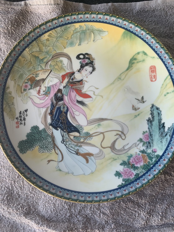 This beautiful Asian plate is a refined work of art that adds a touch of elegance to any room. Crafted from high-quality porcelain, the plate features a detailed depiction of a traditional figure surrounded by lush nature motifs. The vibrant colors and delicate brushstrokes make this piece a visual delight.