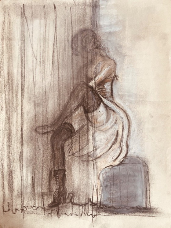Signed charcoal and white pastel painting, female portrait "fitting" on natural paper