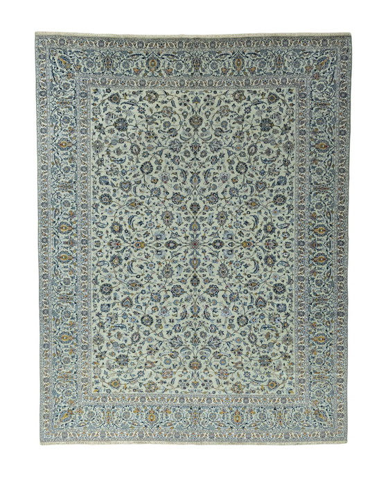 This impressive hand-knotted Kashan cork rug captivates with its fine details and excellent cork wool quality. The harmonious color scheme in pistachio green with blue and gold accents gives this masterpiece an elegant and timeless look.
