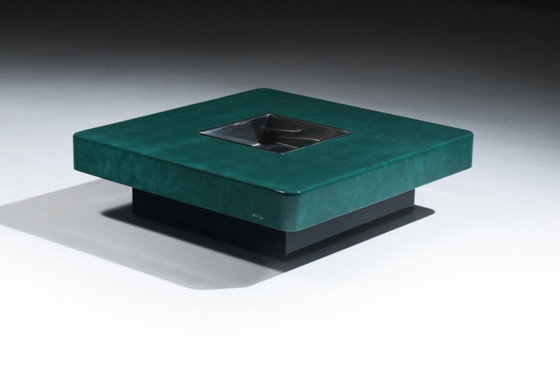The table features a deep emerald-green patinated lacquer, applied by hand to achieve a subtle cloudy depth and a luminous sheen. At its center lies a recessed stainless-steel bucket, designed as an integrated champagne or cocktail cooler. The contrast between the mirror-polished steel and the rich lacquer surface defines the sophisticated aesthetic typical of Rizzo’s studio work.