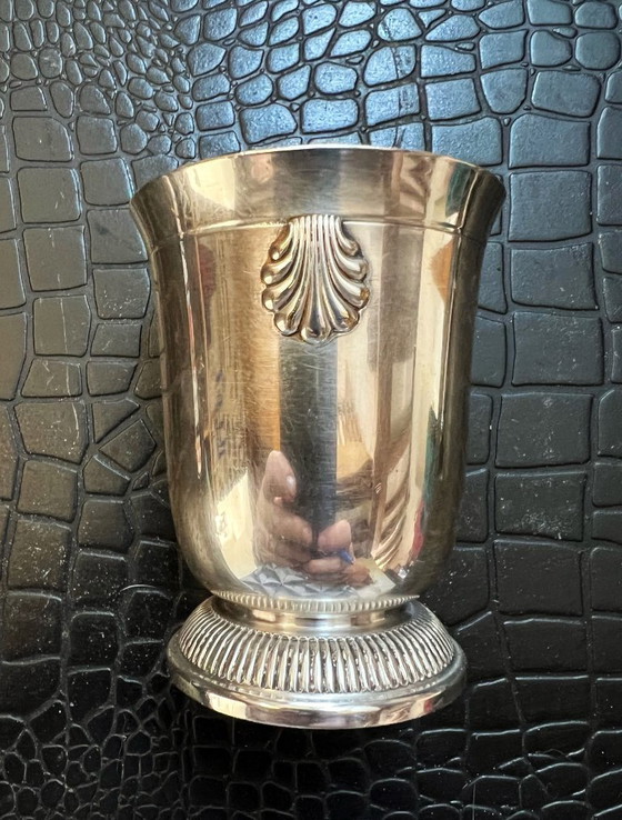 Daniel Crégut is a Parisian silversmith specializing in tableware and baby gifts. His signature is a guarantee of high-quality silver plating. This tulip-shaped cup features a Louis XV or Regency style decoration, characterized by shell motifs on the sides and gadroons (oval relief friezes) on the base. It has a beautiful patina with some minor scratches consistent with its age.