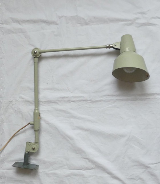 The lamp is painted in a very delicate green. It has two disc joints and one ball joint. It is in good condition with minor signs of wear. There are small scratches on the paint. The shade is made of painted sheet metal and is therefore no longer perfectly round.