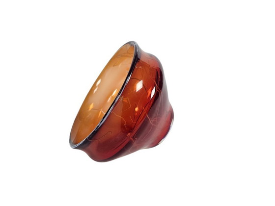 The bowl features a characteristic red-orange color gradient with a unique pattern of fine silver-colored/white lines reminiscent of the structure of a pine cone. Due to its artistic design, the bowl is highly suitable as a collector's item for glass art enthusiasts. Discover the refined elegance of this unique designer vase, crafted by the renowned glassblower Sklárna Svojkov and designed by Jiří Haidl in 2005. This beautiful bowl, with its iridescent finish, captures the light in a way that enlivens any space and adds a touch of artistic flair.