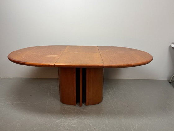 Vintage oval extendable dining table by Skovby, model 74, designed and manufactured in Denmark in the 1960s. This table is distinguished by the clever construction of the central base with two cylindrical legs that slide apart to reveal the extension system. The extensions are typically stored under the tabletop, allowing the table to be expanded from a comfortable six-person table to a table for up to twelve.