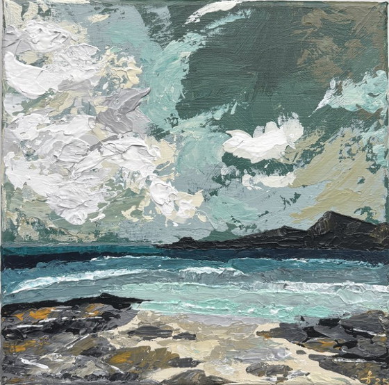 Sky & Stone I is a modern abstract coastal landscape where sky, sea, and rocks converge in a layered interplay of color and texture. The painting is constructed with multiple layers of paint, giving the surface depth and movement. The combination of blue-green hues, sandy accents, and dark rock formations creates a powerful yet balanced whole.