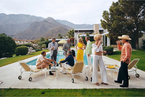 A party by the pool of a desert house designed by Richard Neutra for Edgar J. Kaufmann, in Palm Springs, January 1970. In the group: industrial designer Raymond Loewy (1893 - 1986, center, standing), Nelda Linsk (in yellow), wife of art dealer Joseph Linsk, and Helen Dzo Dzo (second from right).