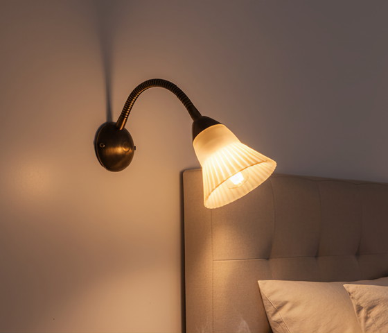 Illuminate your home with this delightful vintage Lucezia wall light probably made in the sixties . Made in solid brass with a heavy fluted glass shade, perfect for adding a touch of charm to any space. The small brass gooseneck design not only offers elegance but also great flexibility, making it ideal for cozy corners or reading nooks. The creme glass shade gently diffuses light, creating a warm and inviting atmosphere. Crafted from durable brass, this piece features a stylish gooseneck for easy adjustment. The beautiful creme thick glass shade complements any decor, adding a vintage flair to your home. Don't miss out on this unique and rare wall light to enhance your living space! This wall light has CE mark for EU and UK use.