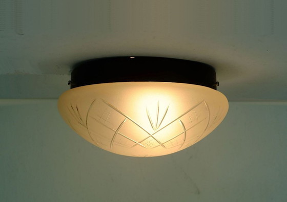 Beautiful sconce or ceiling fixture manufactured in the 1970s. The base is made of matte black lacquered metal, the shade is made of etched glass with geometric pattern. Holds 1 E27 bulb.