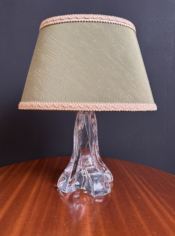 Elegant small Daum crystal lamp (signed) from the 1950s/60s with its original satin celadon green shade; excellent condition; for bayonet bulb
