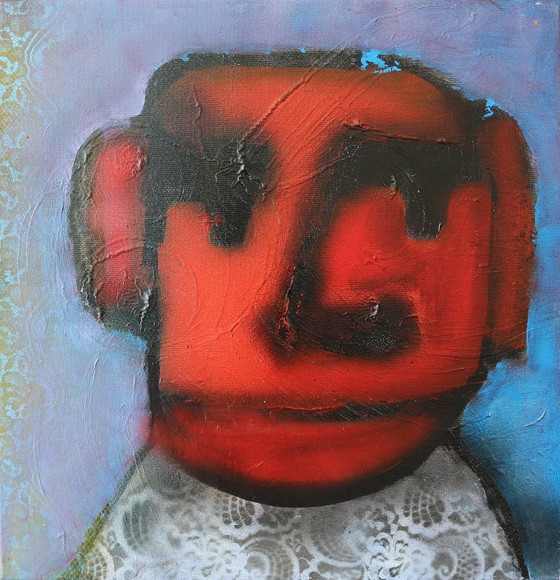 'Red man' ( 2017 ) acrylic and spray can on canvas, wooden frame, 50 x 50 cm.