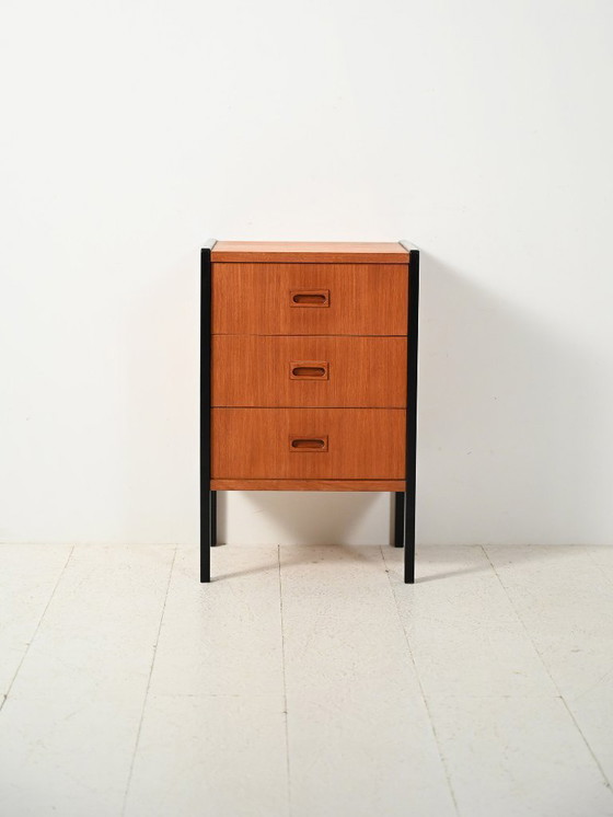 Small Scandinavian chest from the 1960s produced by Bodafors, retaining its original label “Design B. Fridhagen – Made in Sweden 1969”. The teak body is framed by structural black profiles that define the volume, enhanced by visible brass screws as a deliberate decorative detail. Recessed handles and compact proportions reflect the functional clarity of Swedish design of the period.