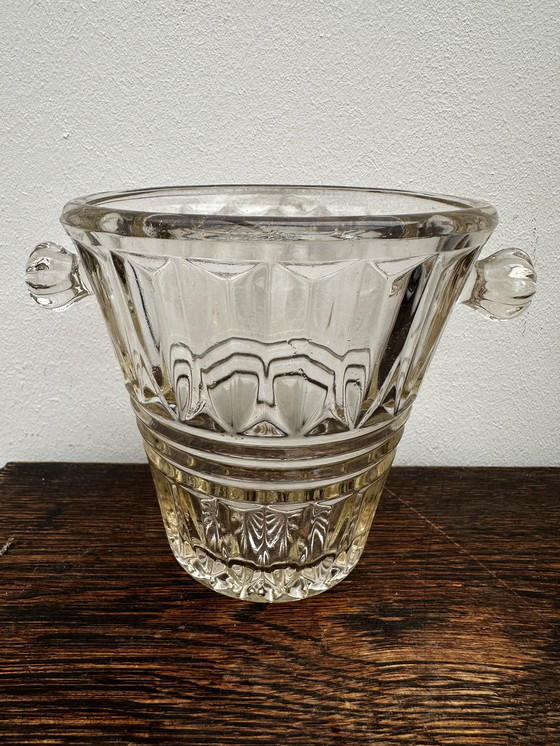 This vintage cut glass ice bucket stands at 12 cm tall, showcasing intricate detailing and a classic design. Perfect for adding a touch of elegance to your gatherings.