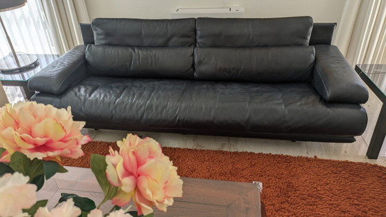 Rolf Benz sofa 2.5 seater in dark blue nappa leather, 226 cm long, deep 92 cm. Adjustable back cushions for extra comfort, black base.