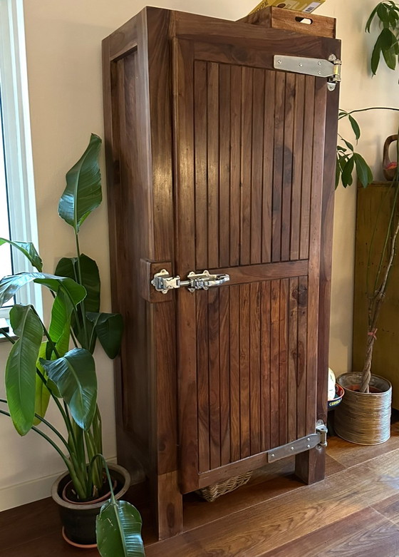 For sale: a beautiful teak cabinet in a repro refrigerator design. Sturdy door hardware. The cabinet is made of solid teak, with a beautiful deep color and grain.