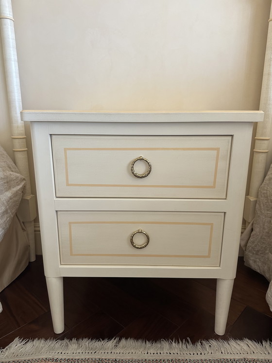 This solid wood bedside cabinet is an elegant and functional piece for any bedroom. With its two spacious drawers, it offers practical storage space for your personal items. The classic design and creamy white finish add a touch of sophistication to your decor. Round golden metal handles perfectly complement the overall aesthetic.
