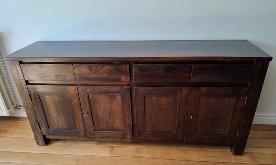 This solid wood colonial-style sideboard is a beautiful example of craftsmanship and elegance. Made from exotic hardwood, it exudes a timeless charm that fits perfectly into both classic and modern interiors. The rich, dark tones of the wood give the piece of furniture a warm and inviting appearance, ideal for your living room or dining room.