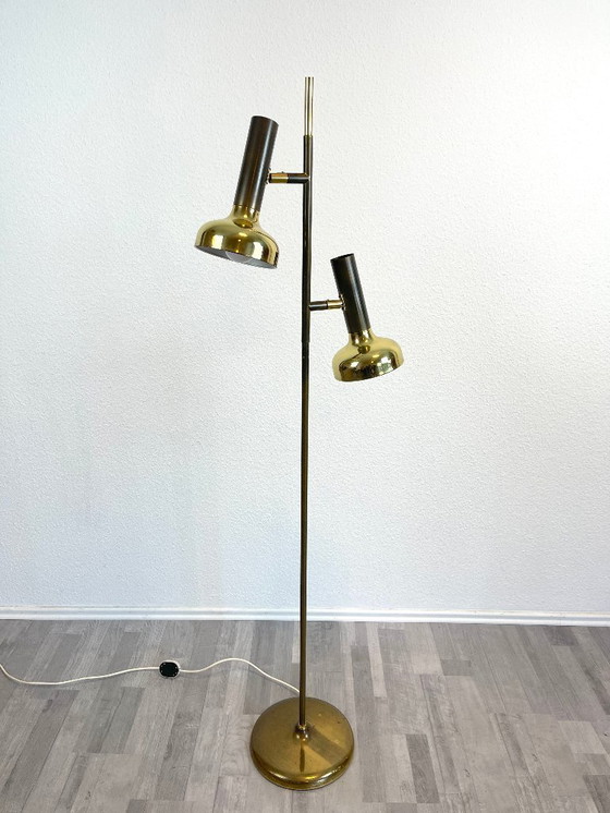 For sale is an elegant two-light floor lamp from Sölken-Leuchten (Neheim-Hüsten). This original lamp from the 1960s/70s impresses with its high-quality combination of brass and copper-anodized elements.