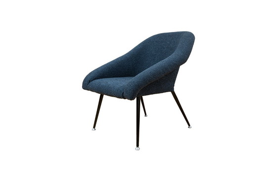 Chair and legs are made of metal. During the renovation process, the chair received new padding and upholstery, navy blue bouclé fabric.