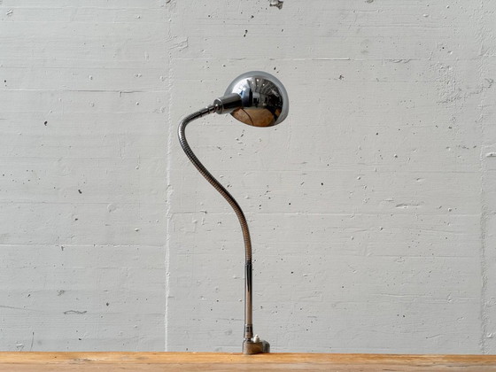 A functional yet distinctive clamp lamp made of chrome-plated metal in the typical Space Age design of the 1970s. The hemispherical lamp head with its mirrored chrome finish provides a focused, warm light and lends the lamp a futuristic, almost sculptural presence. The flexible gooseneck is a particularly noteworthy feature, allowing for precise and individual adjustment of the light. Combined with the sturdy table clamp, the lamp can be attached to tabletops, shelves, or work surfaces in a variety of ways and used flexibly – ideal as task, reading, or accent lighting. A beautiful example of the fusion of technical functionality and iconic 70s design.