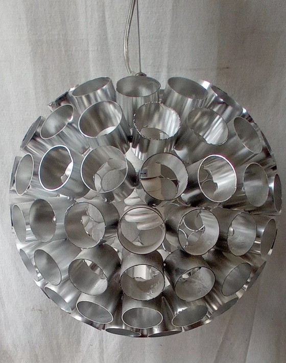This Space Age Chrome Hanglamp is a stunning piece that embodies the futuristic design of the Space Age era. Crafted from chrome, it features a spherical design with multiple circular cutouts, creating a unique and eye-catching appearance. Perfect for adding a touch of retro-futuristic style to any room, this pendant lamp is both functional and decorative. Its reflective surface enhances the lighting effect, making it a standout piece in any setting. It could be made from aluminium.