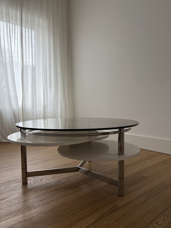 Space age coffee table, 70s vibe. Ideal for mid century modern interiors. The table features a striking glass top that offers a clear view of its unique multi-level structure.
