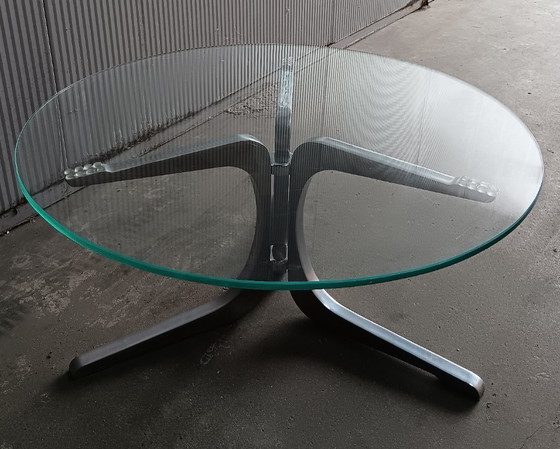 Sculptural Space Age coffee table with a cast aluminum tripod and a thick, round glass top (Ø 74.5 cm). Attributed to Artifort, thanks to the futuristic, organic design typical of 1970s modernism.