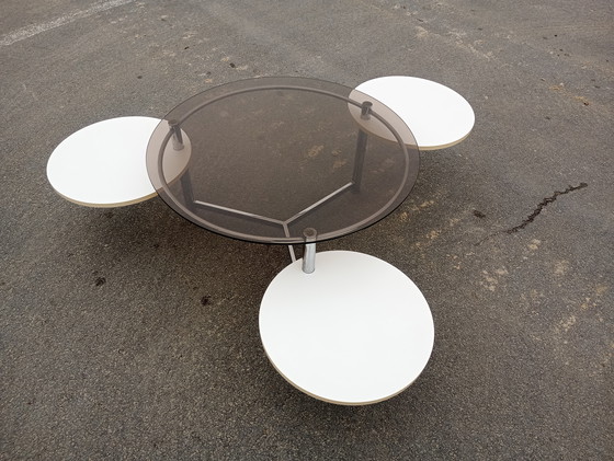 Discover the unique charm of this modular coffee table in a Space Age style. With its elegant combination of chrome and smoked glass, this table offers a futuristic look that fits perfectly into a modern interior. The table is not only a visual statement but also functional thanks to its adjustable elements that offer flexibility and versatility.