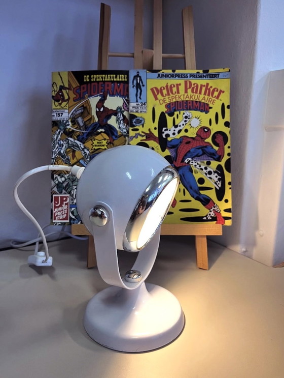 Illuminate your space with this exquisite Space Age eyeball table lamp, a true testament to mid-century modern design. Its sleek, white metal finish and distinctive eyeball shape make it a captivating addition to any room, offering both functionality and style.