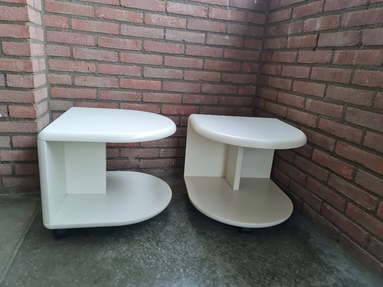 These Space Age vintage design side tables are a beautiful addition to any modern interior. With their sleek lines and futuristic look, they bring a touch of retro-futurism to your living space. Crafted from high-quality wood, the tables are equipped with casters for easy movement.