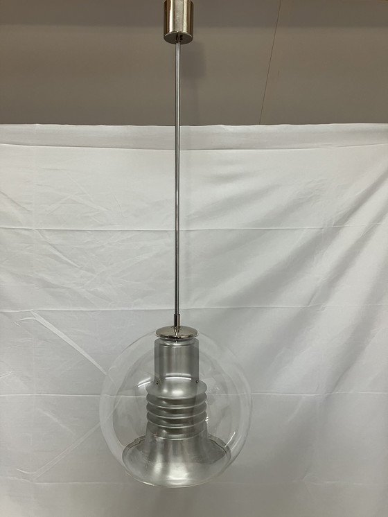 Amazing space age pendant lamp of glass and aluminum, made by Leclair & Schäfer in the 1970s in Germany.