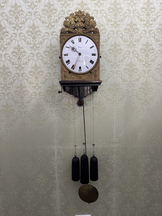 Of course, this antique comtoise also has the well-known repete beat. When electric light did not exist, it gave the owner the opportunity at night to be able to count the number of beats once again. It is equipped with a folding pendulum and features an 8-day verge movement, which means that the clock's weights must be lifted once a week with the supplied crank key. Also special about this clock are the winding holes. Two of them are located at the bottom of the clock, as can be seen in the photos that are part of the description.