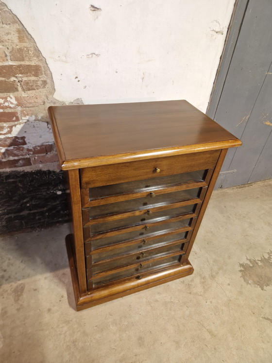 This beautiful specimen cabinet offers a unique opportunity to bring a piece of history into your home. With its glass fronts and brass knobs, this cabinet exudes a timeless elegance that fits perfectly into both classic and modern interiors.