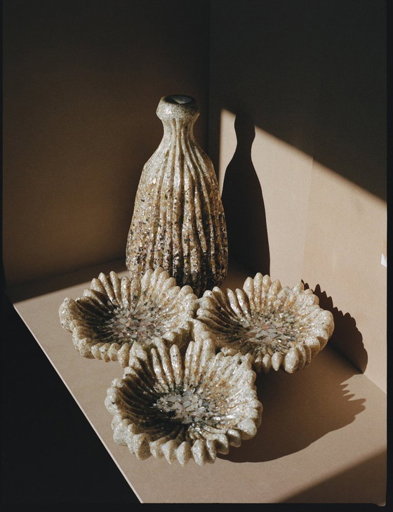 Discover an exceptional collection of French sculptures from the 1960s, crafted from molded resin and inlaid with mother-of-pearl shells and brass leaves.
