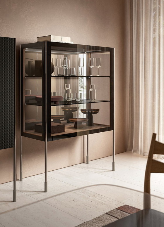 A focal point in the living area, the SPIN collection comprises a series of sideboards, credenzas, and display cabinets illuminated from within by LED lights. Formal elements and, at the same time, an integral part of the design, the door hinges disappear completely into the structure, incorporated within the long legs with a galvanized black nickel finish. The adjustable knurled feet accentuate the slender figure of the piece. The available finishes are the Luxor texture and the new Factory texture.
