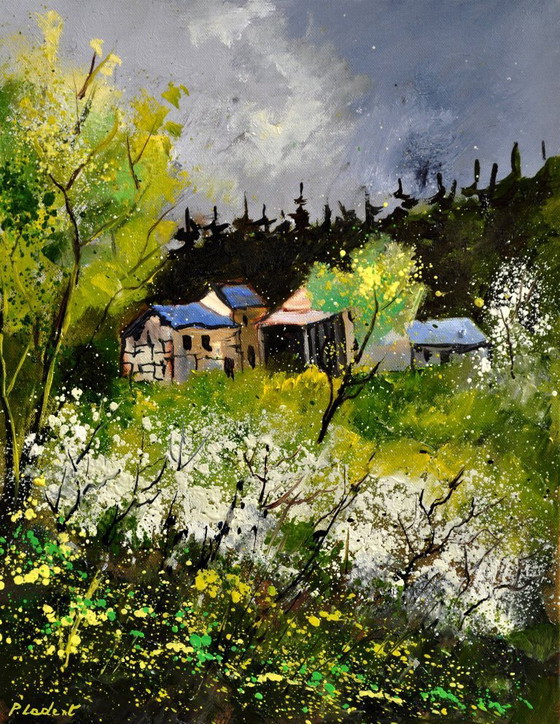 Discover a captivating artwork that evokes the serene beauty of spring. This painting, titled "Spring 4526," captures a bucolic landscape where nature bursts into vibrant bloom. Shades of green and yellow blend harmoniously, creating a lively and refreshing scene.