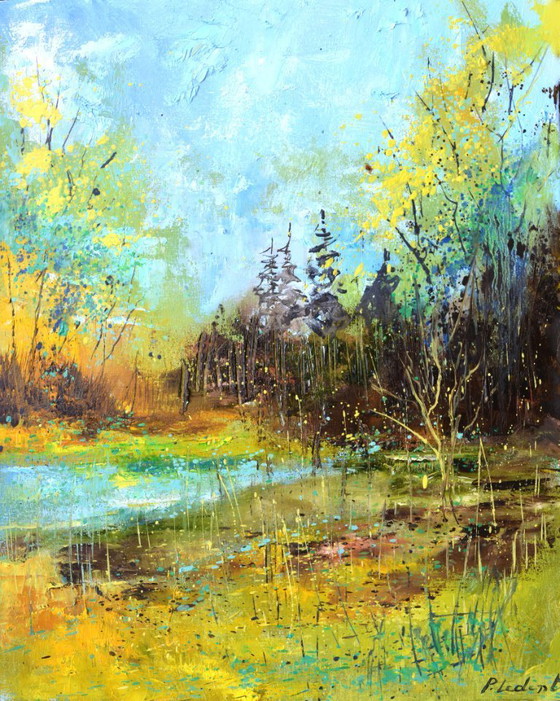 This captivating painting, with its luminosity and dynamism, immerses us in a landscape where nature is in the spotlight. The artist has skillfully juxtaposed vibrant hues of green, blue, and yellow to create a bucolic and lively scene. The composition is dominated by a clearing bathed in light, where a shimmering pond can be seen beneath a serene sky. In the background, tall, majestic trees stand, forming a natural boundary that frames and protects this tranquil space. The brushstrokes of paint, applied with assured gestures, evoke lush, moving vegetation, instilling a sense of lightness and spontaneity. The details, sometimes precise, sometimes suggested, offer a palpable depth and texture. The way the colors blend and collide on the canvas demonstrates striking technical mastery. This landscape encourages contemplation and invites total immersion in the wild and soothing beauty of nature. The work is distinguished by its ability to convey both serenity and vitality, a perfect balance that captivates and enchants.