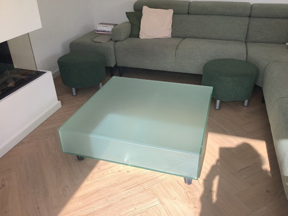 This beautiful square glass table with a frosted glass finish is a sophisticated addition to any modern living room. The sleek design and the subtle green tint of the glass create a fresh and contemporary look that fits perfectly into a minimalist interior.
