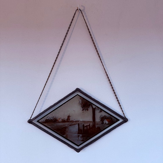 Stained glass, 1910/1920, Art Deco. Unique stained landscape, handmade, in perfect condition.