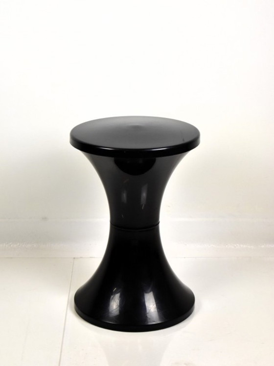 This black plastic stool is an original Tam Tam stool, designed in 1968 by Henry Massonnet for the French brand Stamp. The object has a recognizable hourglass or tulip shape, and consists of two parts that snap together. The stool is multifunctional: it is often used as a seat, side table or decorative object, both indoors and outdoors. In the 1970s, the design became very popular in Europe, partly because of its light weight, stackability and modern look.