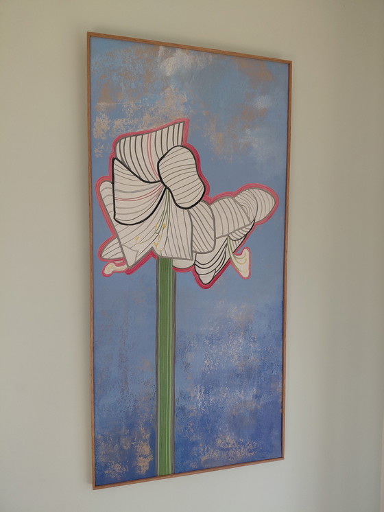 The artwork straddles the line between reality and fantasy. The stripes in the flower evoke pajamas, dreams, dreams, the dreaming flower. The blue colors in the weathered wall behind it contrast with the white amaryllis in front, but also complement each other, creating a unity. The lines and texture in the artwork are vibrant thanks to the visible and tangible relief.