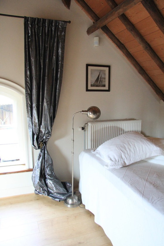 This Bauhaus-style, adjustable standing lamp from Flamant combines functionality with a sleek design. Crafted from high-quality chrome with an antique silver finish, it measures 140 cm high with an additional 25 cm extension (see photo). The base is 23 cm long, and the shade is 17 cm round and 11 cm high.