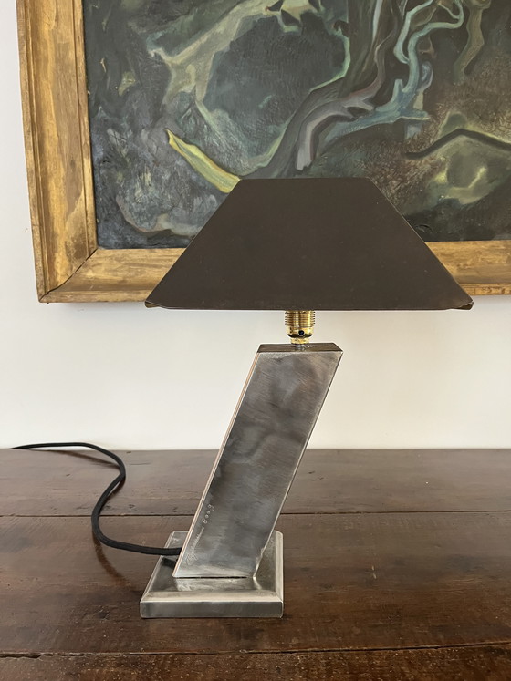 Year 2009 The base is made of solid steel. It is therefore very heavy. The base measures 12 x 12 x 2 cm (H) The lampshade measures 23 x 23 x 10 cm (H)