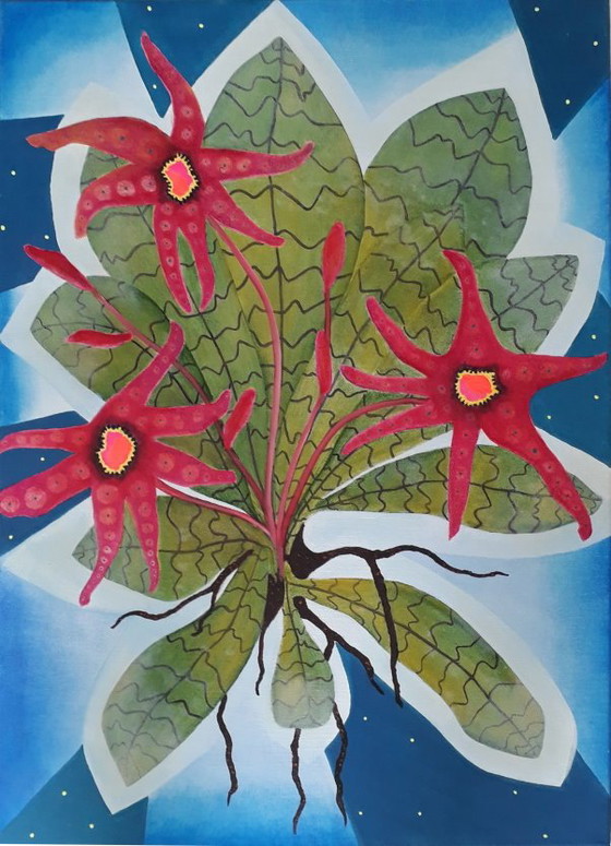 Discover the enchanting beauty of "Stella Maris, Star of the Sea." This abstract canvas artwork captures the essence of the sea with vibrant red and green hues against a blue background. Perfect for modern art lovers who want to enhance their space with a touch of mystery and color. Oil on canvas.