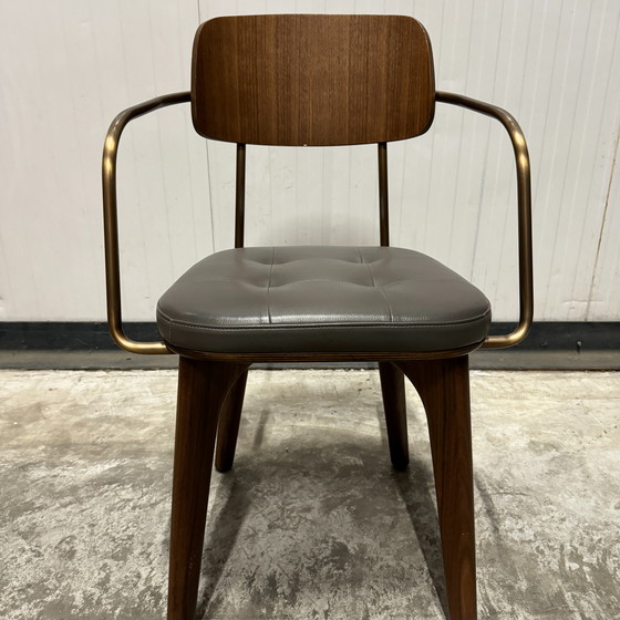 Stellar Works Utility Dining Chair Walnut Stained Ash Legs and Backrest Milan Charcoal Grey 5221 Leather Upholstery Stainless Steel Armrests Slight damage to arm and backrest (see photos) The price shown is a unit price including transport.