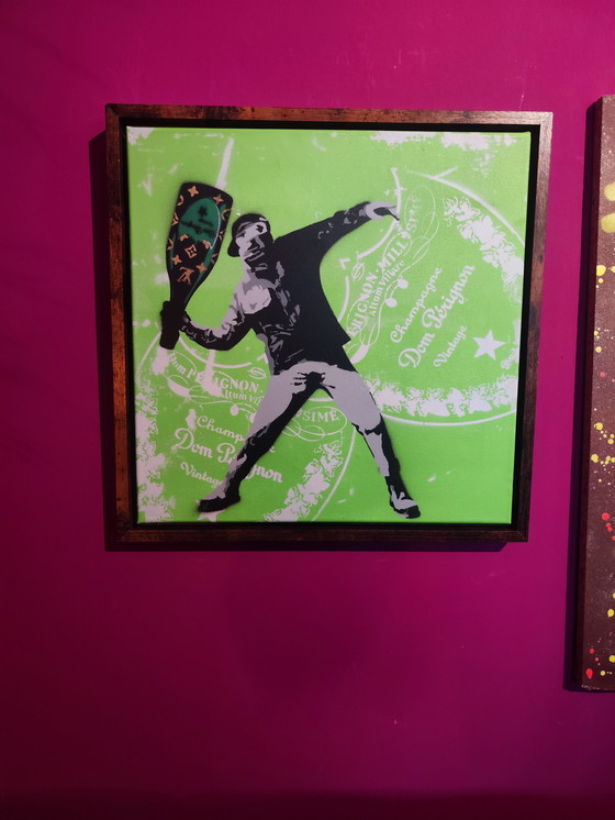 This striking stencil graffiti artwork, known as "The Thrower," brings urban charm and artistic flair to your home. The vibrant green palette and dynamic depiction of a thrower lend any room a modern yet provocative atmosphere.