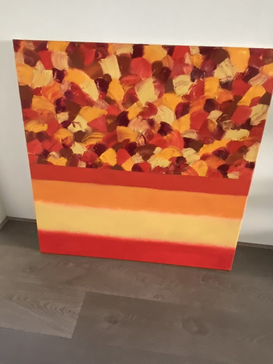 This is a beautiful painting painted in warm tones in red, orange and yellow by the Drenthe artist Milly Betten. The artwork is titled "Stereoscopy 5" and comes from the canvases painted by Milly in 2002 with the theme "Stereoscopy".