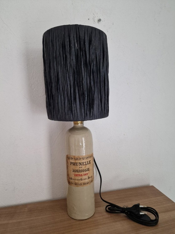 Stoneware lamp with a black raffia shade. Total height: 53cm Shade diameter: 18cm Cable length: 1.5m Uses a small screw-in bulb