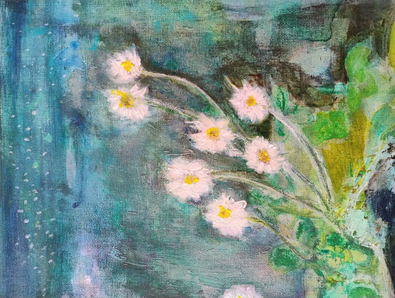 This painting, titled 'Storm', was created as encouragement during difficult times. The daisies represent courage and resilience.