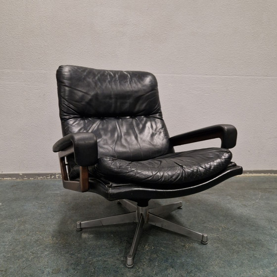 Experience the charm of the 1960s/70s with this Strassle vintage leather swivel chair. This chair combines comfort and style with its luxurious black leather upholstery and elegant wooden armrests. The metal base provides a sturdy base and makes the chair swivel, ideal for any modern living space.