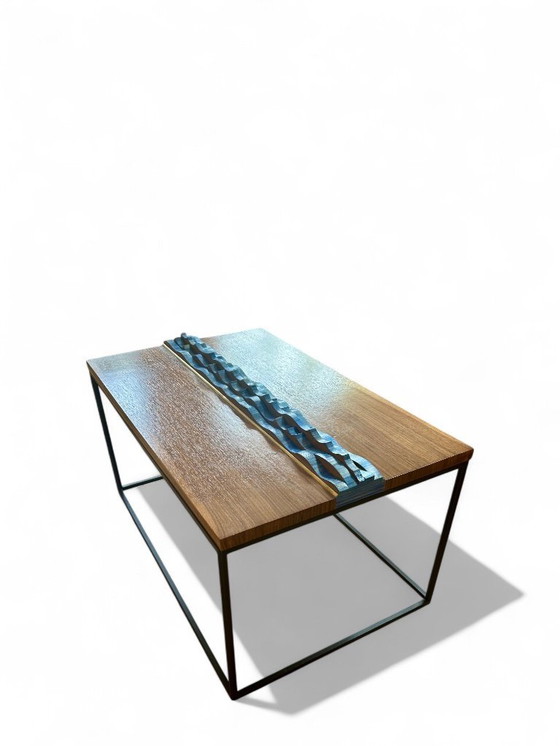 River table-style coffee table, except that instead of epoxy, it's made of real waves in relief, in walnut and covered with rye straw.